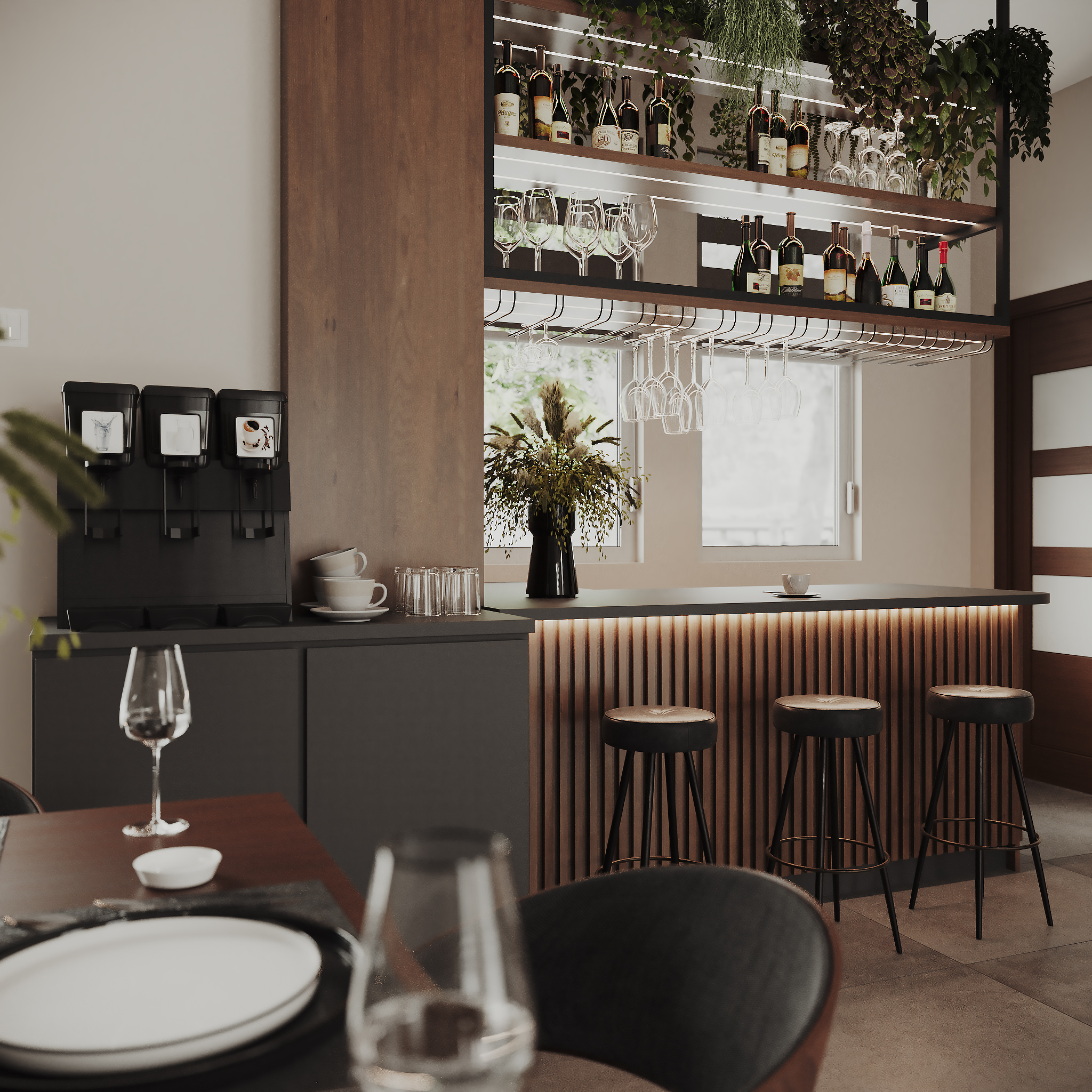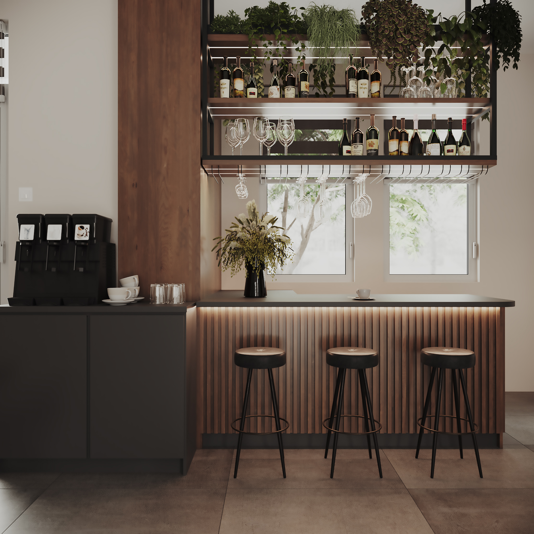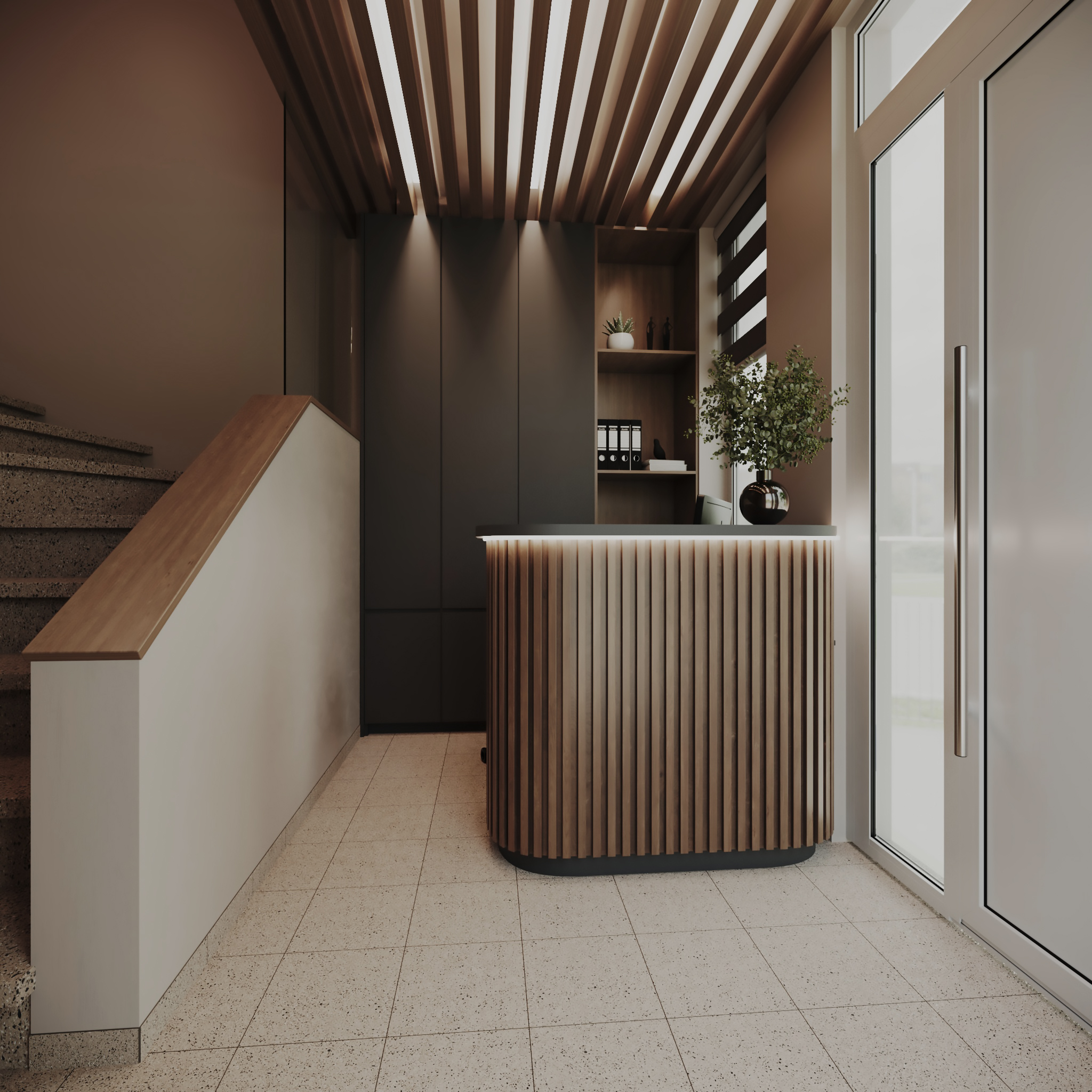 The reception area now feels calm and welcoming, with warm wood tones and smooth, curved lines. Behind the bar, open shelving, glassware, and greenery create a balanced mix of function and style. Fluted textures add depth without being overwhelming. Every part of the space was designed to feel easy, natural, and comfortable—for both staff and guests. It's a place meant to be enjoyed, not rushed.